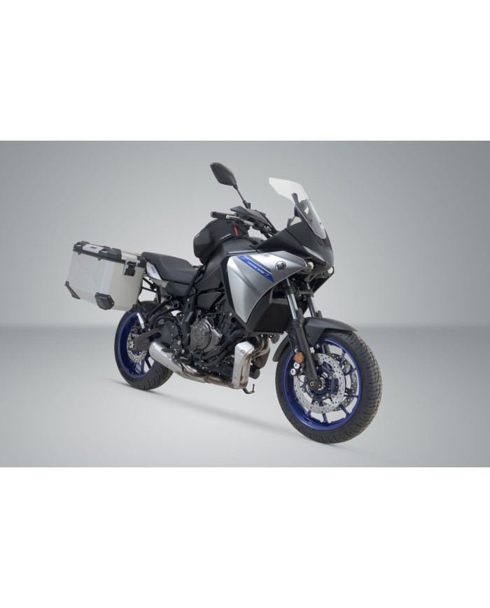 Die robusten TRAX ADV Alukoffer fühlen sich auf jeder Strecke zuhause: Designprägungen unterstützen die Stabilität des 1,5 Millimeter starken, geschweissten Aluminium-Wandmaterials. Ein komplett abnehmbarer Deckel mit Tragegriffen aus eloxiertem Aluminium und Schnellverschlüssen erleichtert Be- und Entladen der Motorradkoffer, die abgeschrägte Seitenkante gibt hohe Bodenfreiheit bei der Kurvenfahrt. Mit dieser Komplettlösung hast du alle benötigten Komponenten, um direkt mit TRAX auf grosse Reise zu gehen: Zwei wasserdichte TRAX ADV Seitenkoffer, zwei abnehmbare SW-MOTECH Seitenträger, Adapterkit, Schloss-Satz, Öffnungsbegrenzer und Diebstahlsicherung zum attraktiven Gesamtpreis. Die modellspezifischen Träger und die Grösse der Koffer sind perfekt auf Heckgeometrie und Auspuffanlage des Motorrades abgestimmt.