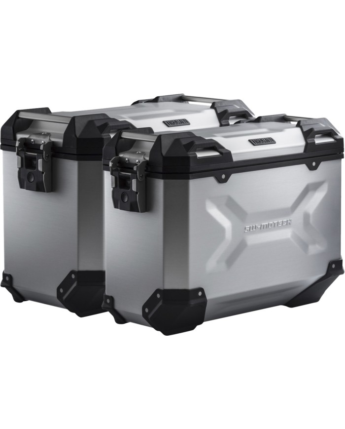 Die robusten TRAX ADV Alukoffer fühlen sich auf jeder Strecke zuhause: Designprägungen unterstützen die Stabilität des 1,5 Millimeter starken, geschweissten Aluminium-Wandmaterials. Ein komplett abnehmbarer Deckel mit Tragegriffen aus eloxiertem Aluminium und Schnellverschlüssen erleichtert Be- und Entladen der Motorradkoffer, die abgeschrägte Seitenkante gibt hohe Bodenfreiheit bei der Kurvenfahrt. Mit dieser Komplettlösung hast du alle benötigten Komponenten, um direkt mit TRAX auf große Reise zu gehen: Zwei wasserdichte TRAX ADV Seitenkoffer, zwei abnehmbareSW-MOTECH-Seitenträger, Adapterkit, Schloss-Satz, Öffnungsbegrenzer und Diebstahlsicherung zum attraktiven Gesamtpreis. Die modellspezifischen Träger und die Größe der Koffer sind perfekt auf die Heckgeometrie und die Auspuffanlage des Motorrads abgestimmt.