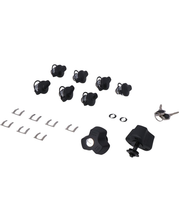 Der TRAX Schloss-Satz mit Diebstahlsicherung besteht aus den drei Schlössern zum Abschließen der Kofferdeckel, drei weiteren Schlössern zum Abschließen der Koffer an den Seitenträgern, einem Schloss für die Werkzeugbox sowie zwei Diebstahlsicherungen mit Schlössern für EVO Seitenträger.