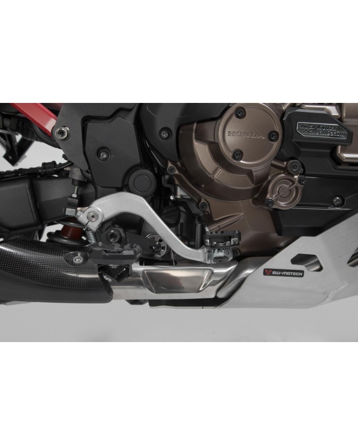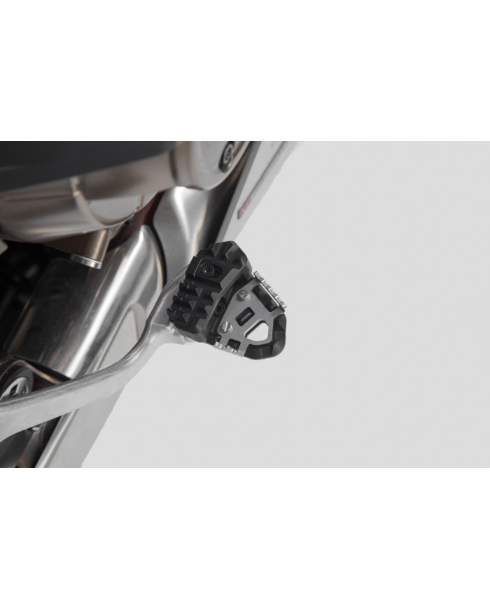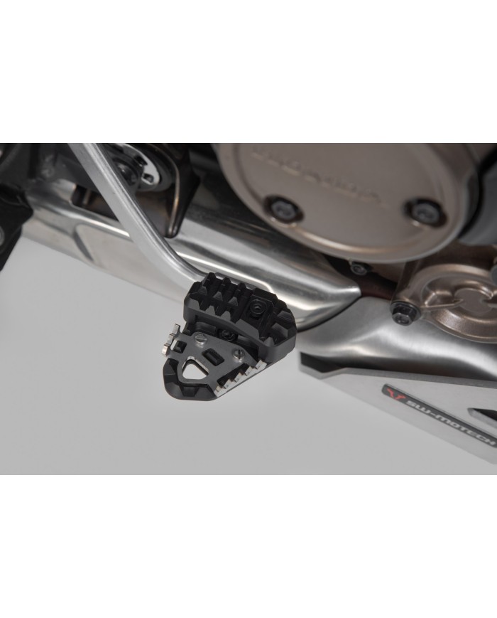 SW-MOTECH fertigt die Erweiterungen aus gefräster und hochfester Aluminiumlegierung mit schwarz eloxierter Oberfläche und mit einem Auftrittsblech in Edelstahl. Für eine optimale Anpassung an die Ergonomie lässt sich die Erhöhung des Bremshebelauftritt in zwei Stufen von 22 oder 27 Millimetern einstellen.