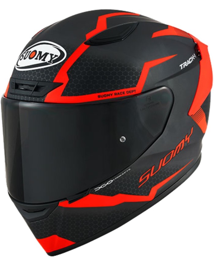 Der TRACK-1 ist der neue Integralhelm der nächsten Generation von Suomy, gefertigt aus dem TRICARBOCO-Verbundmaterial (Kevlar/Carbon/Glasfaser). Charakterisiert durch dynamische, leistungsorientierte Formen, wurde er im Windkanal entwickelt, um die optimale Balance zwischen Strassen- und Rennstrecken-Einsatz zu gewährleisten.