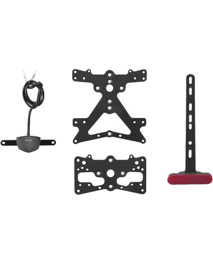 Der aus Aluminium gefertigte Kennzeichenträger Fox ist speziell für das jeweilige Motorradmodell konzipiert. Dadurch passt er sich nicht nur perfekt an die Liniengebung des Motorrads an, sondern punktet zudem durch eine einfache und schnelle Montage. Jedes Kit enthält alle benötigten Montageteile, wobei keine Veränderungen an OEM-Teilen vorgenommen werden müssen. Maximale Funktionalität auf kleinstem Raum und Einhaltung der Zulassungsstandards. Die Fox-Kits enthalten eine SMD-LED-Kennzeichenbeleuchtung, einen Reflektor und Adapter für Rizoma-Blinker, sind verstellbar und mit einem Feststeller zur Fixierung der korrekten Neigung ausgestattet.