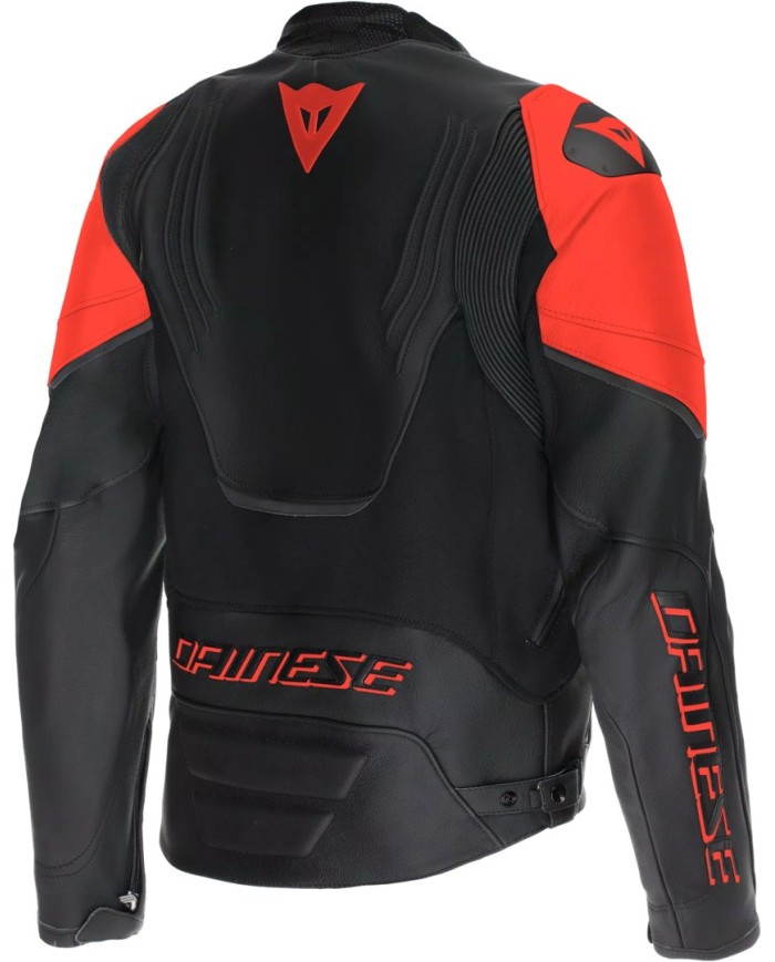 Motorradlederjacke mit sportlicher und bequemer Passform, Slidern aus Aluminium an den Schultern, elastischen Ledereinsätzen und Lufteinlässen für maximalen thermischen Komfort. Die jüngste Weiterentwicklung der Sportjacke von Dainese.