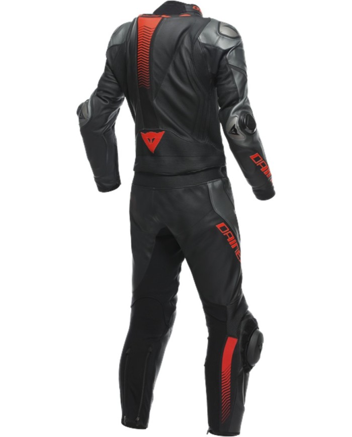 Zweiteiliger Motorradanzug aus Leder mit elastischen Tri-Axial-Einsätzen am Rücken und Verbundprotektoren an Schultern, Ellbogen und den Knien. Ergonomisch, vielseitig und schützend.