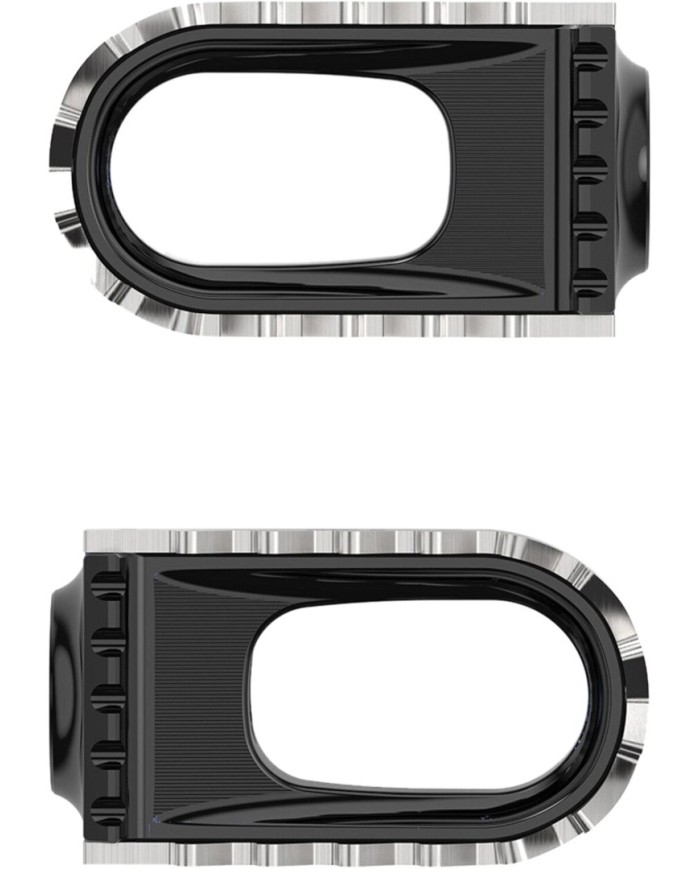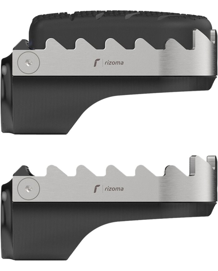 Vielseitigkeit und Komfort. Das sind die Konzepte hinter der Escape S-Fussraste, einer Kombination aus Funktionalität und Liebe zum italienischen Design. Entwickelt, um den Alltagsanforderungen gerecht zu werden und sich im Offroad-Bereich zu beweisen. Die Escape S, ist aus Aluminium gefertigt, verfügt über einen EPDM-Gummi, der Vibrationen dämpft und einen rutschfesten Halt für ein komfortableres und entspannteres Fahrgefühl bietet. Der Gummi lässt sich leicht anbringen und passt perfekt in die Zahnung der Fussraste. Kein Detail wird dem Zufall überlassen, die Oberflächenveredelung vereint zwei Besonderheiten: 1. Altera Textur, ein exklusives Rizoma-Design, mit der Neigung und Platzierung seiner Form, die den Halt optimieren sollen, und 2. das All-Terrain-Symbol, das den Willen zum Erkunden aller Strecken, auch der unbekanntesten, zulässt. Tatsächlich eignet sich die Fussraste durch das Entfernen des Gummieinsatzes für den harten Einsatz im Gelände. Die äusseren Zähne aus glasiertem Stahl sind so konzipiert, dass einen verbesserten Halt bieten, insbesondere wenn der Fahrer einen höheren Fussdruck auf die äussere Seite der Fussraste ausübt. Dank der 45 mm breiten Basis haben Sie sowohl mit dem Stiefel einen ausgezeichneten Halt als auch eine bessere Kontrolle beim Stehen. Die Aussparung der Fussraste bietet Schmutz weniger Halt und wird dadurch leichter. Darüber hinaus ermöglicht ihre Länge von 81 mm eine grössere Wendigkeit an engsten Stellen.