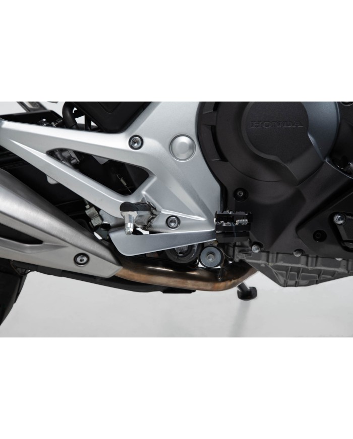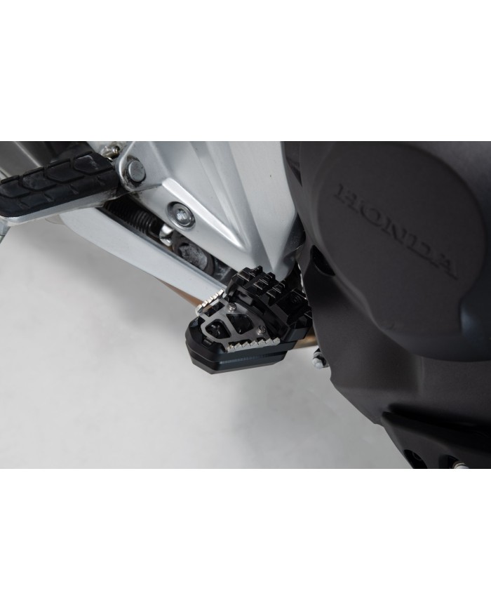 SW-MOTECH fertigt die Erweiterungen aus gefräster und hochfester Aluminiumlegierung mit schwarz eloxierter Oberfläche und mit einem Auftrittsblech in Edelstahl. Für eine optimale Anpassung an die Ergonomie lässt sich die Erhöhung des Bremshebelauftritt in zwei Stufen von 22 oder 27 Millimetern einstellen.