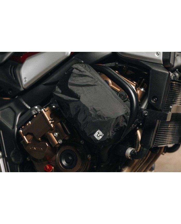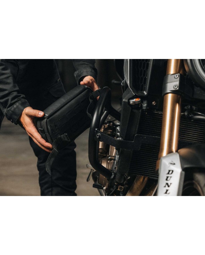 Das robuste Polyestermaterial mit softem Touch in Kombination mit strukturiertem Kunstleder im klassischen Schwarz verleiht den praktischen Taschen im kleinen Format eine dezente und zugleich edle Optik. Diese Taschen können auf jedem MOLLE-Aufsatz und den mitgelieferten Riemen an verschiedenen Stellen am Motorrad befestigt werden.