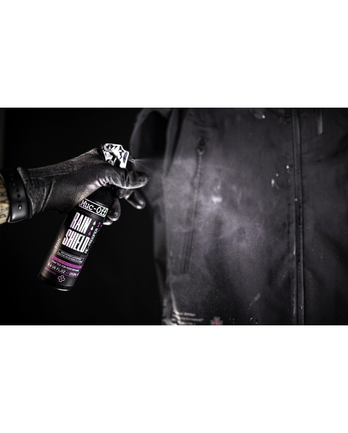 Sie trotzen den Elementen? Dann holen Sie sich unser neues Rain Shield Re-proofer Spray. Es erzeugt eine hochmoderne DWR-Schicht (Durable Water Repellent) auf allen Arten von technischer Kleidung.\nEs ist eine einfach anzuwendende, aufgesprühte Imprägnierung, die die werkseitige Leistung aller wasserdichten und atmungsaktiven Stoffe wiederherstellt. Es nutzt die neueste Technologie, um die Oberflächenspannung des Gewebes zu verringern und die bestmögliche Wasserdichtigkeit zu gewährleisten, ohne die Atmungsaktivität des Gewebes zu beeinträchtigen. Ausserdem schützt es vor Schlamm und Flecken, die sich im Boden festsetzen. Und das Beste daran? Es ist sicher für die Umwelt, da es auf Wasserbasis hergestellt ist und keine PFCs enthält!\nUnsere hochmoderne ?Spray-on?-Formel bietet innerhalb von 24 Stunden nach der Behandlung einen unübertroffenen Schutz. Nach dem Auftragen perlt das Wasser ab, so dass Sie auch unter den härtesten Bedingungen geschützt sind und losradeln können.