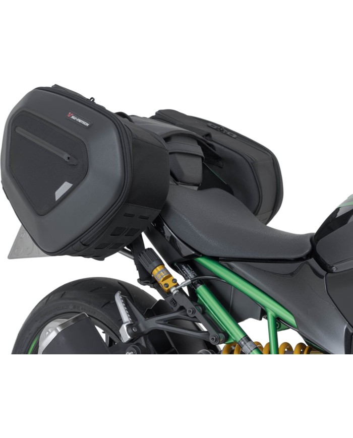 Die PRO BLAZE Satteltaschen mit abnehmbaren Abstandsbügeln bestechen durch sportliche Optik, geringes Gewicht und ein cleveres Befestigungssystem. SW-MOTECH fertigt die Taschen aus robustem und besonders UV beständigem 1680D Ballistic Nylon. In Verbindung mit Seitenwänden aus formstabilem EVA-Material wird das Gepäck vor Spritzwasser und Staub geschützt. Gezielt entwickelt für sportliche Motorräder beeinträchtigen die Satteltaschen die Fahreigenschaften nur minimal. Wer ohne Gepäck unterwegs ist, kann die Abstandsbügel mit einem Handgriff abnehmen und an der Maschine verbleiben nur unauffällige Halterungen.