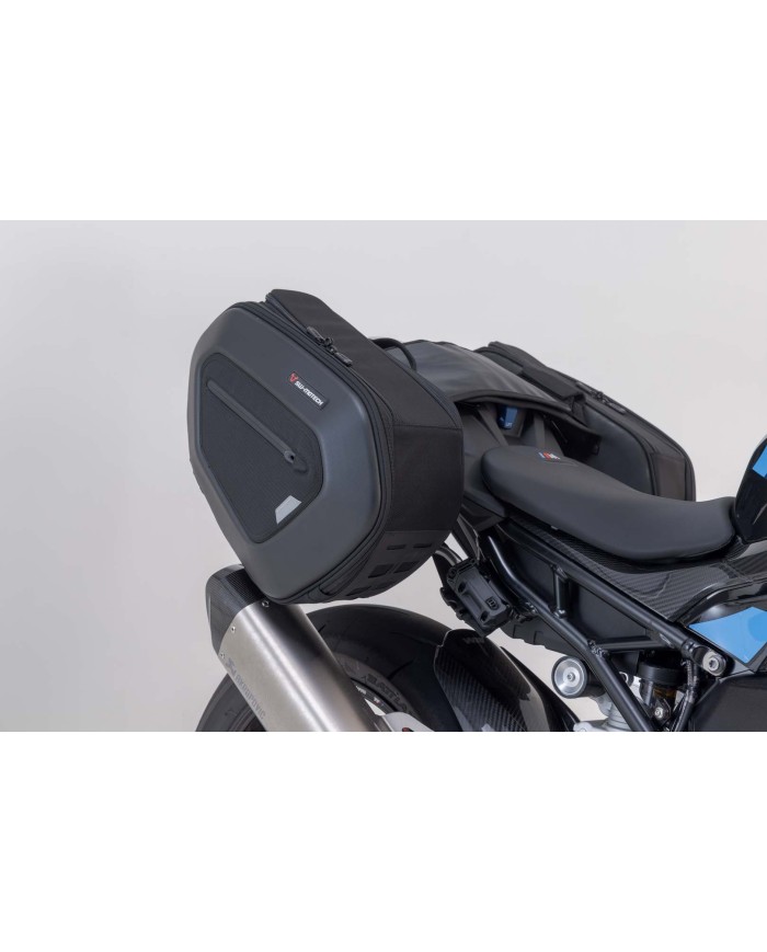 Die PRO BLAZE Satteltaschen mit abnehmbaren Abstandsbügeln bestechen durch sportliche Optik, geringes Gewicht und ein cleveres Befestigungssystem. SW-MOTECH fertigt die Taschen aus robustem und besonders UV beständigem 1680D Ballistic Nylon. In Verbindung mit Seitenwänden aus formstabilem EVA-Material wird das Gepäck vor Spritzwasser und Staub geschützt. Gezielt entwickelt für sportliche Motorräder beeinträchtigen die Satteltaschen die Fahreigenschaften nur minimal. Wer ohne Gepäck unterwegs ist, kann die Abstandsbügel mit einem Handgriff abnehmen und an der Maschine verbleiben nur unauffällige Halterungen.