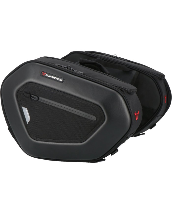 Die PRO BLAZE Satteltaschen mit abnehmbaren Abstandsbügeln bestechen durch sportliche Optik, geringes Gewicht und ein cleveres Befestigungssystem. SW-MOTECH fertigt die Taschen aus robustem und besonders UV beständigem 1680D Ballistic Nylon. In Verbindung mit Seitenwänden aus formstabilem EVA-Material wird das Gepäck vor Spritzwasser und Staub geschützt. Gezielt entwickelt für sportliche Motorräder beeinträchtigen die Satteltaschen die Fahreigenschaften nur minimal. Wer ohne Gepäck unterwegs ist, kann die Abstandsbügel mit einem Handgriff abnehmen und an der Maschine verbleiben nur unauffällige Halterungen.