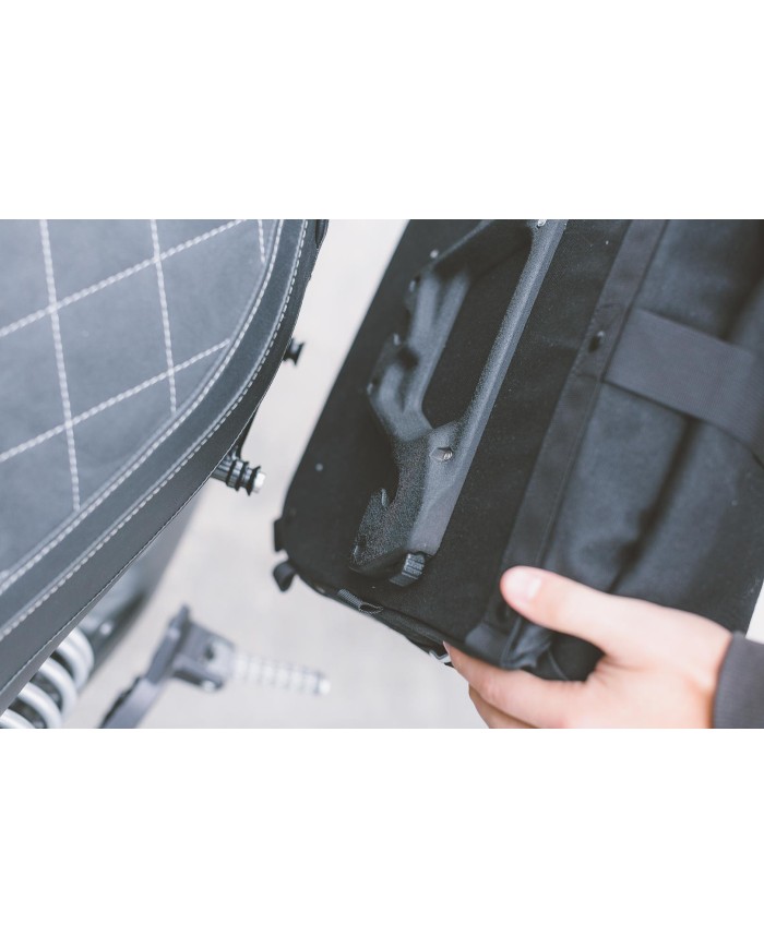 - Als Alternative zum Metall-Träger, etwa für Umbauten und Custom Bikes, bietet sich der universell einsatzbare Legend Gear SLS Satteltaschen-Halter an.