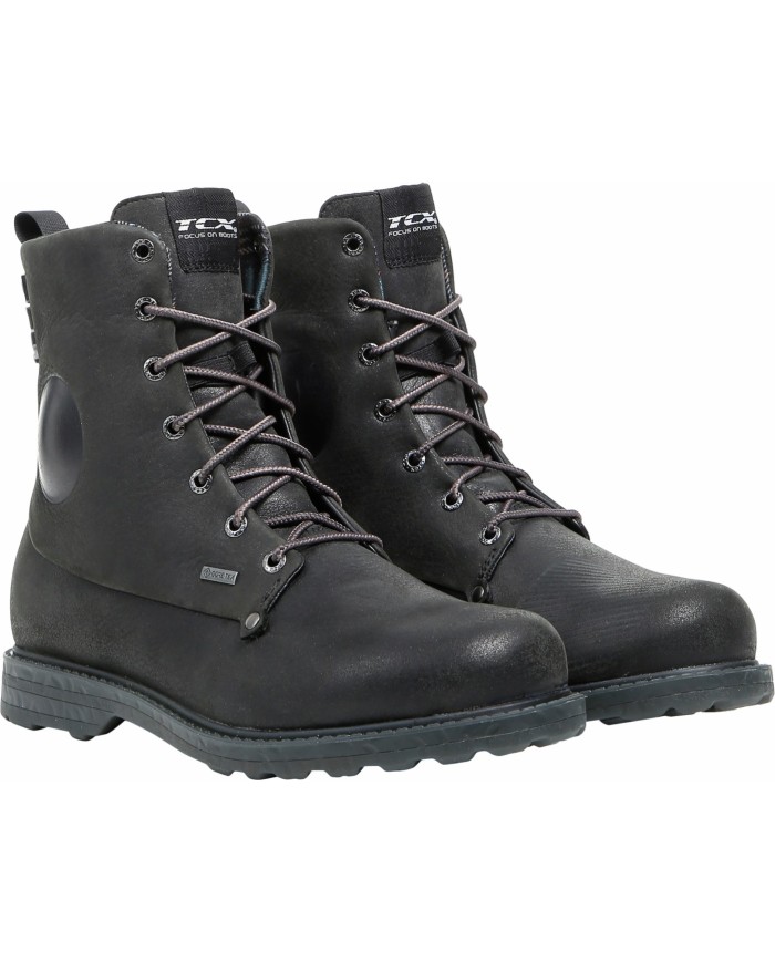 Die TCX Blend 2 GTX Motorradstiefel sind zertifizierte wasserdichte Amphibien-Schnürstiefel aus Vollnarbenleder mit wasserdichter und atmungsaktiver Gore-Tex®-Membran und einem Vintage-Pull-up-Finish-Effekt. Sie sorgen durch die Schutzeinsätze an den Knöcheln und die Verstärkungen im Wechsel-, Zehen- und Fersenbereich für höchste Sicherheit.