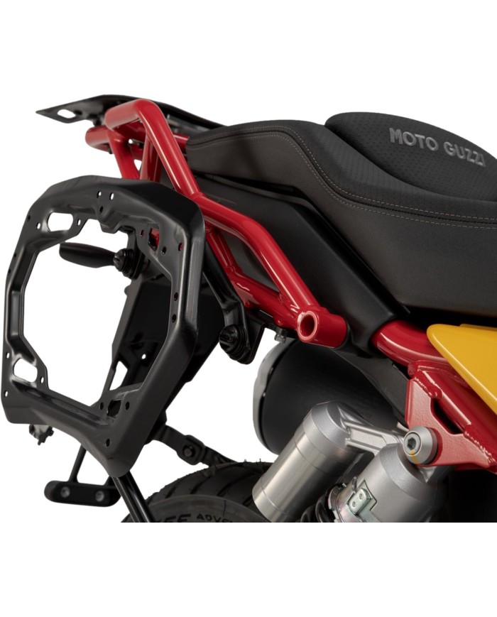 Le support latéral PRO offre un maintien sûr aux valises latérales ainsi qu'au SysBag WP L - les kits d'adaptation correspondants sont disponibles séparément. Les nombreux trous fonctionnels du support latéral PRO permettent la fixation d'autres accessoires.