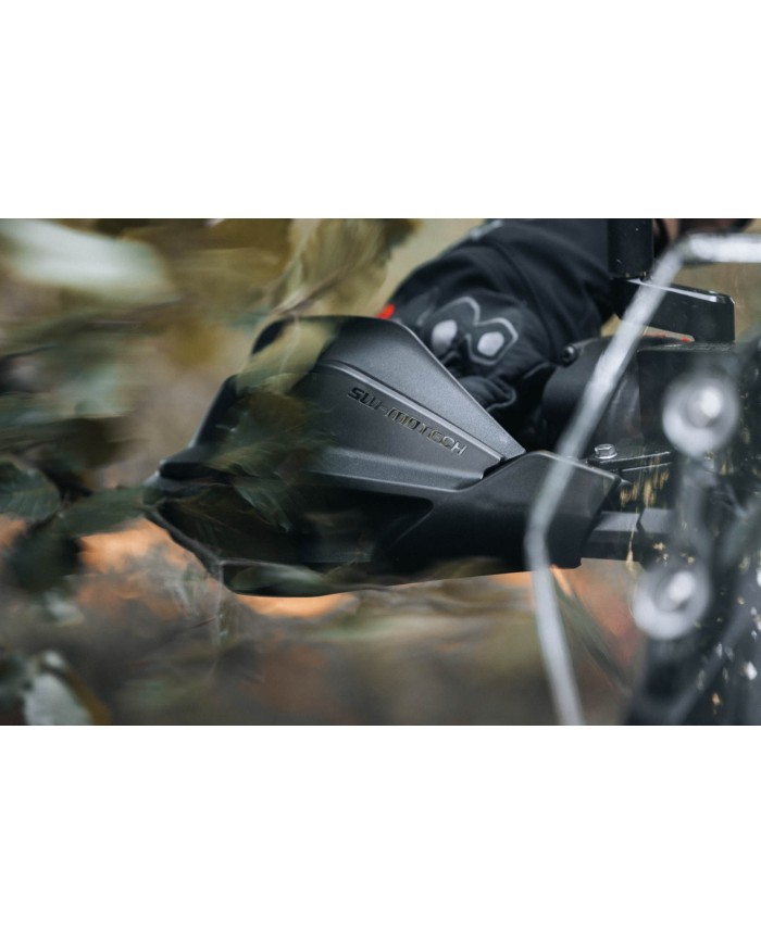 \nGrâce à la forme fermée des coques Adventure, le guidon et les mains sont également couverts sur les côtés. Pour encore plus de protection, le kit de pads de chute disponible séparément peut être fixé aux protège-mains. Pour une meilleure protection contre les intempéries, le kit d'extension, qui agrandit la surface de protection des coques Adventure, est disponible.