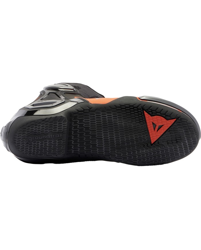 Un design emblématique est associé à des solutions technologiques de pointe, dont l?Axial Distorsion Control System en carbone kevlar, la construction IN avec velcro, pour faciliter la connexion avec les combinaisons de course Dainese, les sliders interchangeables en magnésium et la semelle de course Groundtrax® qui met l?accent sur l?adhérence et la résistance à la chaleur.