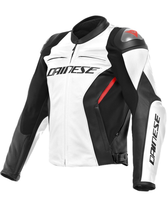 La veste de moto Dainese Racing 4 est dotée d'une fermeture Éclair en bas, permettant de la raccorder au pantalon de moto, et de protections composites certifiées conformes à la norme EN 1621.1 aux coudes et aux épaules, ces dernières étant en outre protégées par des plaques en aluminium externes et interchangeables ? une technologie distinctive de Dainese ? concues pour aider et favoriser la glissade en cas de chute et éviter ainsi les risques de roulades dangereuses sur le bitume.