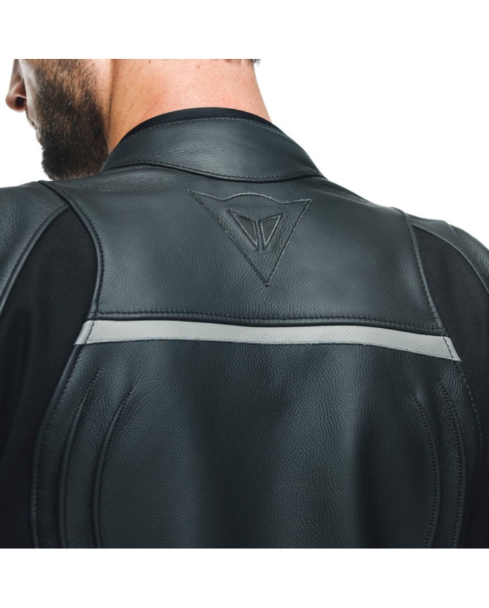 Veste de moto en cuir à coupe moulante et confortable, sliders métalliques sur les épaules, inserts en cuir élastique et prises d?air pour un confort thermique maximal. La veste sportive Dainese.