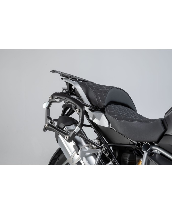 - Pour le montage de valises latérales sur le support latéral PRO, des kits d'adaptation spécifiques sont nécessaires. Ceux-ci sont disponibles séparément pour les valises SW-MOTECH des séries TRAX ADV, TRAX ION et AERO ABS ainsi que SysBag WP L avec plaque d'adaptation. Des kits d'adaptation sont également disponibles séparément pour les systèmes de valises d'autres fabricants.