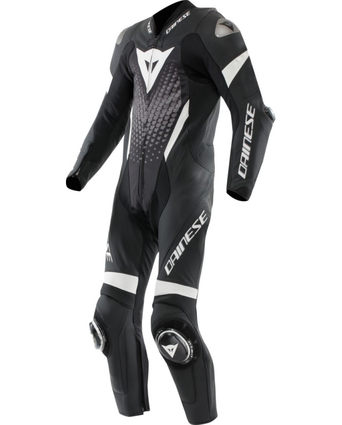 Combinaison une pièce en cuir de vache Tutu haut de gamme perforé, dotée de plaques en aluminium aux épaules et d?une bosse aérodynamique prévue pour accueillir la poche à eau du kit d?hydratation. L?icône racing de Dainese.