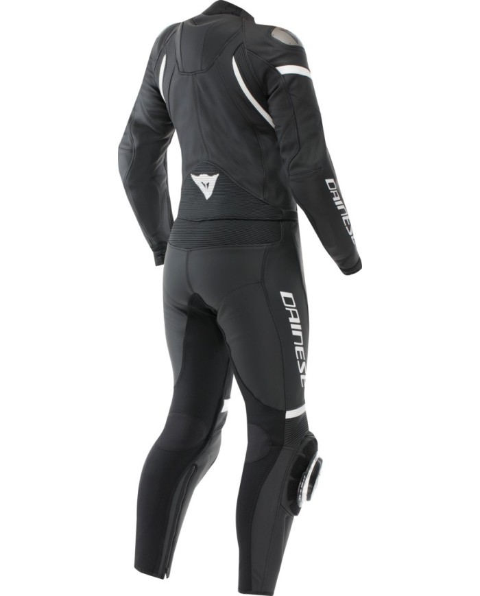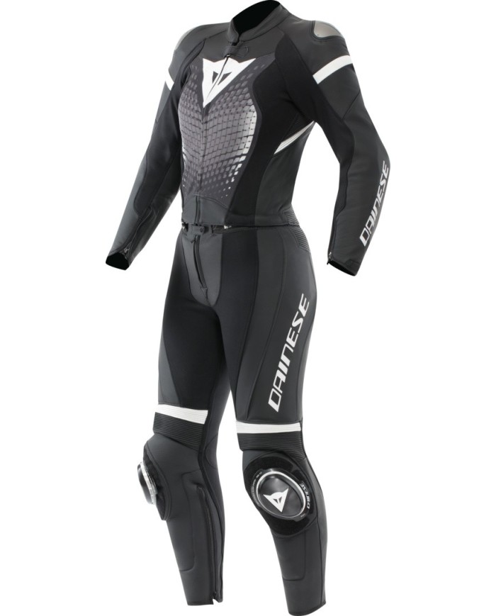 Cette combinaison deux pièces pour femme a été concue pour s?adapter parfaitement à la morphologie du corps féminin, grâce à l?association du somptueux cuir de vache Tutu, qui garantit résistance, élasticité et respirabilité intégrée, et des larges inserts en tissu bi-stretch S1 sur toute la longueur de la combinaison.