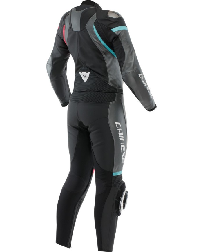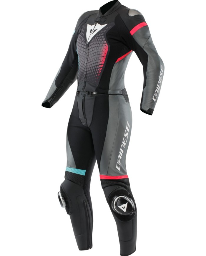 Cette combinaison deux pièces pour femme a été concue pour s?adapter parfaitement à la morphologie du corps féminin, grâce à l?association du somptueux cuir de vache Tutu, qui garantit résistance, élasticité et respirabilité intégrée, et des larges inserts en tissu bi-stretch S1 sur toute la longueur de la combinaison.