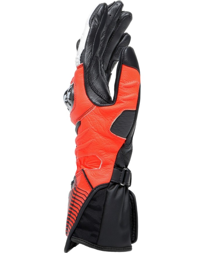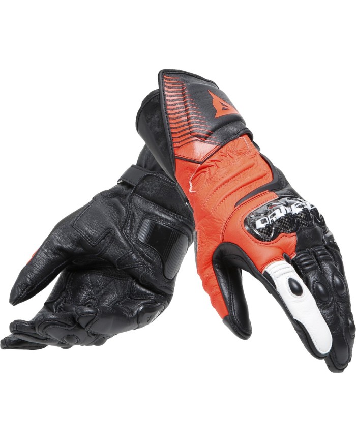 Les gants de moto longs Dainese Carbon 4 sont des gants longs certifiés qui, grâce à l'utilisation de matériaux techniques issus de la course, tels que le cuir de chèvre pour leur construction et le carbone pour les protège-poignets ergonomiques, offrent un haut niveau de protection. Ils répondent aux normes de sécurité Dainese les plus élevées et sont équipés du système DCP pour protéger l'auriculaire, d'une manchette renforcée et de coutures des doigts placées à l'intérieur pour un maximum de robustesse et de confort.