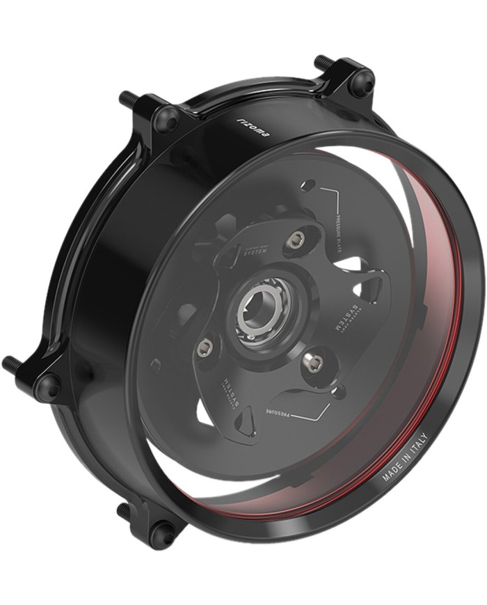 Les composants internes ont été développés pour garantir l'excellence esthétique et technique. Le système de ventilation de l'embrayage, composé d'une plaque de pression en aluminium léger et d'un anneau de pression, est spécialement concu pour optimiser au maximum le circuit d'huile de l'embrayage à l'intérieur du couvercle. De plus, Rizoma a sélectionné des vis en titane pour la fixation des pièces internes afin de minimiser les masses en mouvement et d'augmenter la résistance mécanique. Pour une meilleure expérience d'achat et d'installation, le couvercle d'embrayage est vendu en kit, contenant toutes les pièces nécessaires au remplacement complet des composants OEM, y compris un roulement à billes de plaque de pression pré-assemblé, et a été concu pour une installation rapide plug-and-play.
