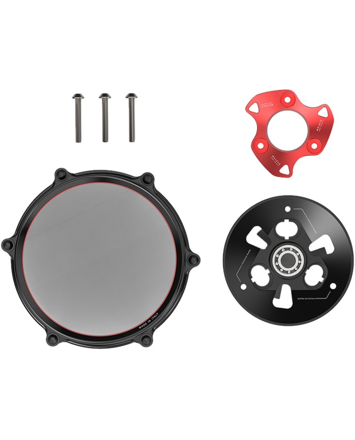 Les composants internes ont été développés pour garantir l'excellence esthétique et technique. Le système de ventilation de l'embrayage, composé d'une plaque de pression en aluminium léger et d'un anneau de pression, est spécialement concu pour optimiser au maximum le circuit d'huile de l'embrayage à l'intérieur du couvercle. De plus, Rizoma a sélectionné des vis en titane pour la fixation des pièces internes afin de minimiser les masses en mouvement et d'augmenter la résistance mécanique. Pour une meilleure expérience d'achat et d'installation, le couvercle d'embrayage est vendu en kit, contenant toutes les pièces nécessaires au remplacement complet des composants OEM, y compris un roulement à billes de plaque de pression pré-assemblé, et a été concu pour une installation rapide plug-and-play.
