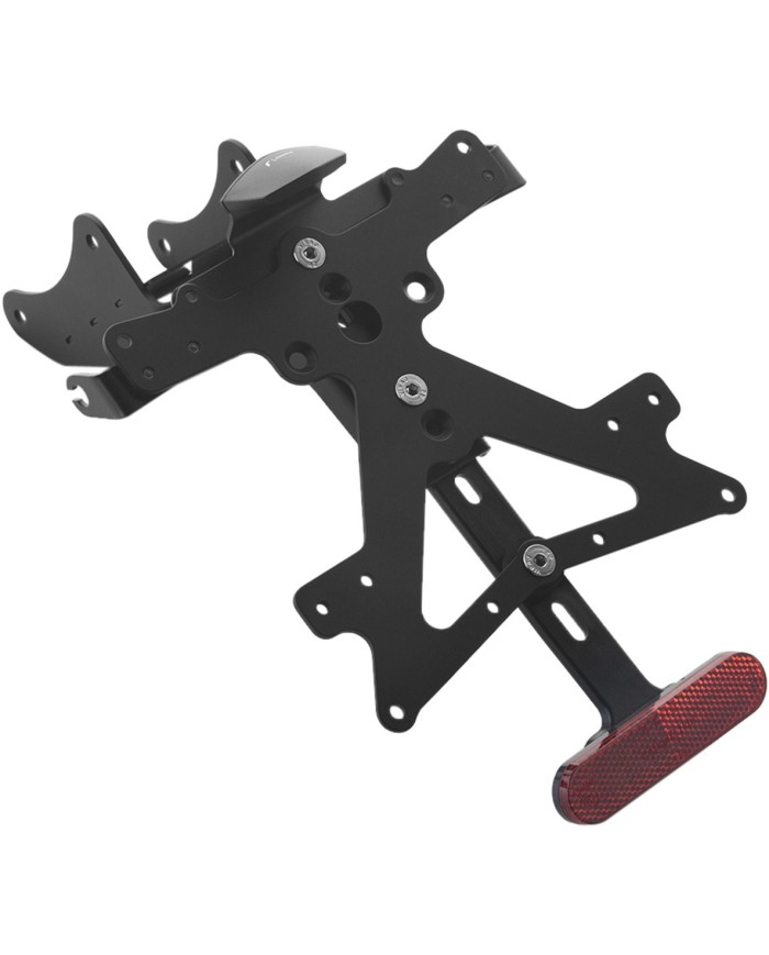Le support de plaque d'immatriculation Fox en aluminium est spécialement concu pour chaque modèle de moto. Cela lui permet non seulement de s'adapter parfaitement aux lignes de la moto, mais aussi de se distinguer par une installation simple et rapide. Chaque kit contient toutes les pièces de montage nécessaires, sans qu'il soit nécessaire de modifier les pièces OEM. Fonctionnalité maximale dans un espace réduit et respect des normes d'homologation. Les kits Fox comprennent un éclairage de plaque d'immatriculation à LED SMD, un réflecteur et sont réglables avec un dispositif de verrouillage pour fixer l'inclinaison correcte.