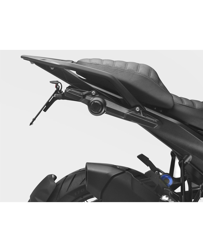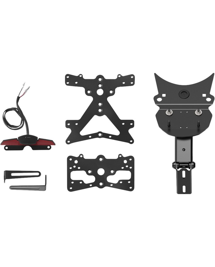 Le support de plaque d'immatriculation Fox en aluminium est spécialement concu pour chaque modèle de moto. Cela lui permet non seulement de s'adapter parfaitement aux lignes de la moto, mais aussi de se distinguer par une installation simple et rapide. Chaque kit contient toutes les pièces de montage nécessaires, sans qu'il soit nécessaire de modifier les pièces OEM. Fonctionnalité maximale dans un espace réduit et respect des normes d'homologation. Les kits Fox comprennent un éclairage de plaque d'immatriculation à LED SMD, un réflecteur et des adaptateurs pour repositionner les clignotants OEM ainsi que les adaptateurs nécessaires pour le montage éventuel de clignotants Rizoma, sont réglables et équipés d'un dispositif de verrouillage pour fixer l'inclinaison correcte.