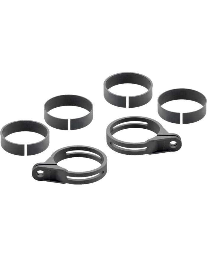 Le kit contient 3 colliers de serrage pour les différents diamètres de fourche (50/52 mm) des différents modèles de motos (Ø 48-55 mm). Tous les composants de ce kit de montage sont fabriqués en technopolymère : cette fibre synthétique est très flexible et il n'est donc pas nécessaire de retirer le pont supérieur de la fourche pour l'installation.