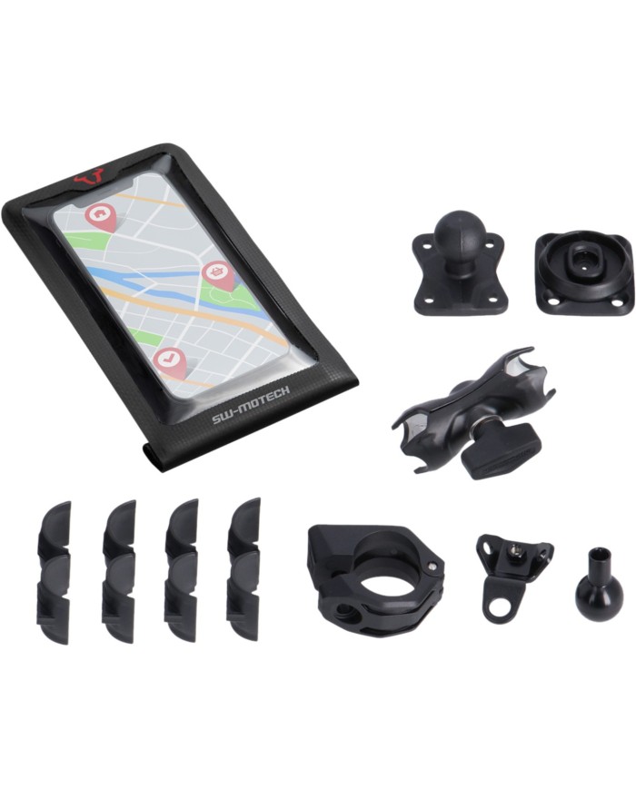 Ce kit tout-en-un comprend un sac étanche pour smartphone et divers éléments de fixation. Le support T-Lock à l'arrière du sac étanche pour smartphone permet une fixation rapide sur le kit de navigation universel : avec un quart de tour dans le sens des aiguilles d'une montre, le sac étanche pour smartphone est fixé au bras de serrage.