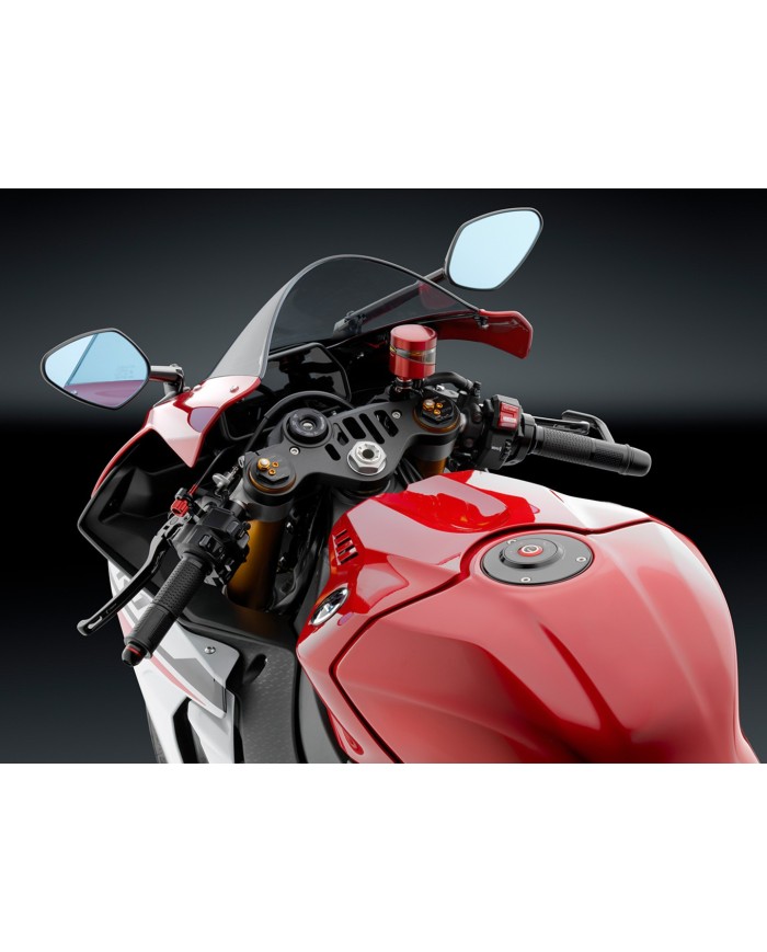 La ligne de rétroviseurs Rizoma est élargie par le rétroviseur nouvellement concu avec clignotant intégré. En combinant différents matériaux et surfaces, ce design élégant et simple a été créé avec un haut degré d'esthétique. Grâce au verre convexe et résistant, teinté en bleu, ainsi qu'à la large surface réfléchissante, le rétroviseur offre une excellente visibilité.