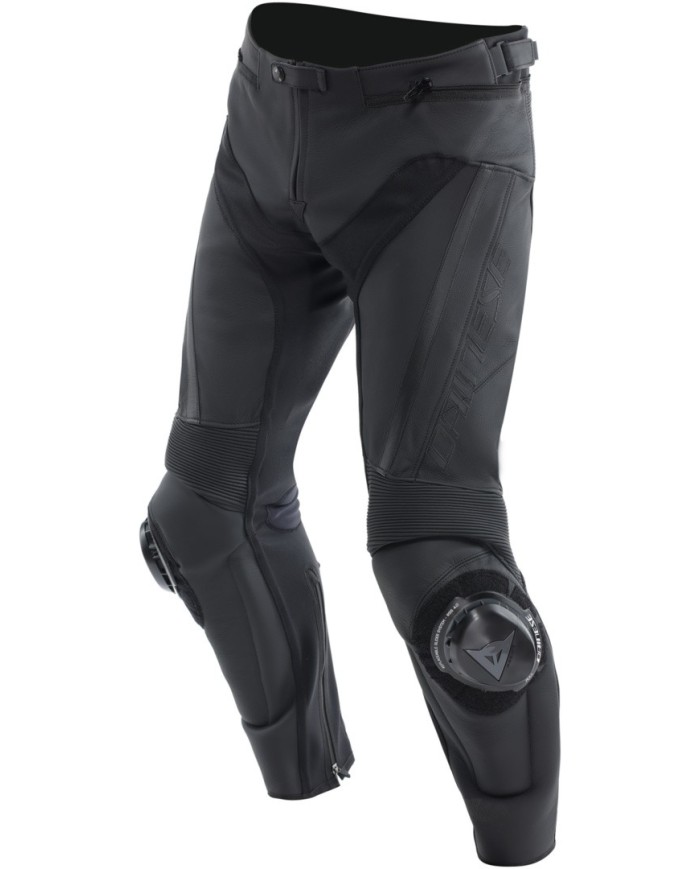 Pantalon de moto en cuir de vache Tutu, avec empiècements en tissu élastique S1 et protections certifiées. Il se porte avec les vestes Racing 4 et Avro 5.