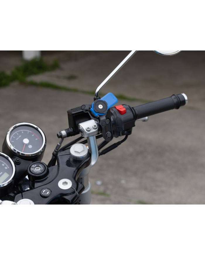 Fabriqué à partir de nylon renforcé de fibre de verre Base en aluminium moulé sous pression anodisé Axes de pivot et inserts filetés en acier inoxydable Fixations en acier à haute résistance avec frein filet micro-encapsulé Pas de trou de la base de montage 32 mm - 38 mm (1 1/4\" - 1 1/2\") La tête d'indexation est décalée vers l'intérieur loin des commandes du guidon Sans main et peut être monté sur le côté gauche ou droit de la motoCe qui est inclus1 support pour maitre cylindre de frein/embrayage Quad Lock®2 boulons à bride dentelée M6 x 45 avec frein filet2 boulons à bride dentelée UNC 1/4\"-20 x 1,75 avec frein filet2 entretoises1 clé hexagonale (Allen) combinée de 3 mm/4 mm