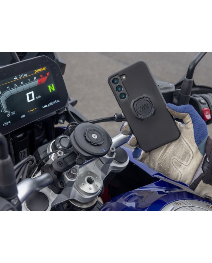 Le Motorcycle Mount de Quad Lock est le système de fixation ultime pour les motards. Il est compatible avec toutes les coques Quad Lock ainsi que l?adaptateur universel Quad Lock. Le support se monte facilement à un endroit bien visible de votre choix. Une rallonge incluse dans l?emballage permet de le fixer à votre guise pour ne pas être gêné par le smartphone. Grâce au Motorcycle Mounts sure et robuste ton portable peut te guider sur la route et tu peux partager avec ta famille ou tes amis les photos prises en route.