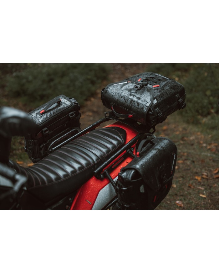 Le SysBag M WP est une solution robuste de bagagerie souple, qui arbore un look aventureux. Il se monte soit à l'arrière, soit sur le support SLC, soit au moyen de boucles.