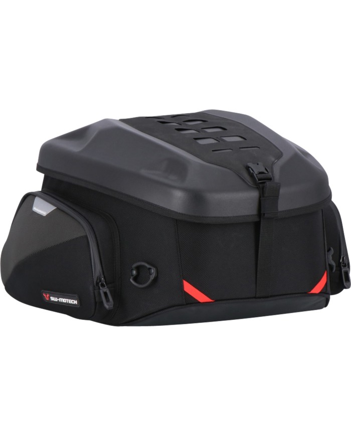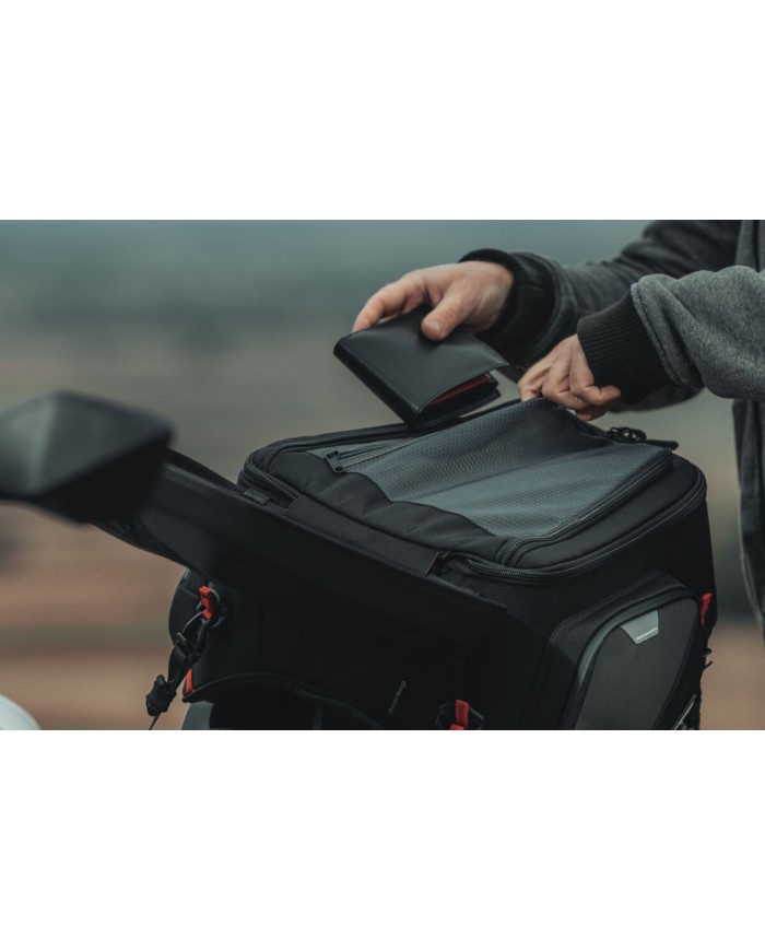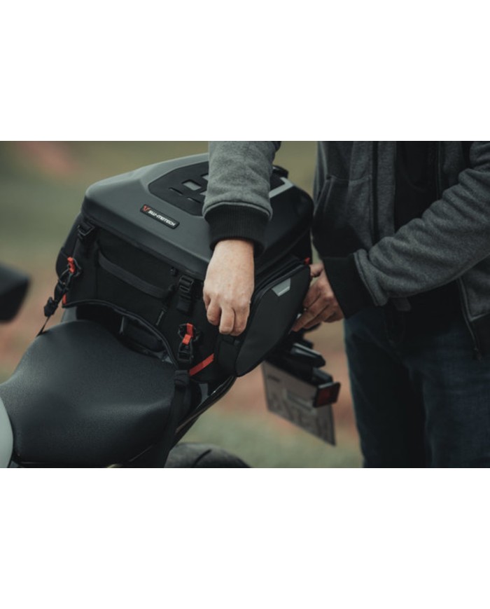 Grâce à sa forme universelle, la sacoche PRO Rearbag est tout aussi adaptée à une utilisation sur une moto routière que sur la selle passager d'une enduro. Avec un volume initial de 22 litres pouvant être étendu à 34 litres, la sacoche offre une place suffisante pour des bagages sur la selle passager de ta moto. Ton casque peut facilement être rangé dans la Rearbag. La face inférieure d'une forme légèrement incurvée s'adapte au siège et est fabriquée en matière antidérapante. La partie supérieure de la sacoche de selle PRO Rearbag en matière EVA pressée et indéformable offre une fixation en toute sécurité de pochettes accessoires sur le système d'attache MOLLE cousu. La sacoche de selle de la série PRO est produite à partir de nylon balistique 1680D très résistant, concu à l'origine pour un usage militaire. De plus, elle se démarque par ses finitions de qualité et des caractéristiques bien pensées : des empiècements réfléchissants améliorent la visibilité, de solides crochets de fixation permettent d'attacher les sacoches de facon simple et rapide à l'arrière et un système MOLLE sur le dessus permet de fixer des pochettes accessoires. Les crochets de fixation brevetés permettent une fixation flexible des sacoches de selle PRO. Un seul geste suffit dès lors pour ancrer et tendre la sangle. Pour retirer la sacoche, la sangle est relâchée en un seul geste, et s'enlève de l'anneau de fixation en tirant sur le cordon. Il est possible de bloquer la longueur de sangle en trop grâce à un système Velcro®. La sacoche peut être utilisée sur différentes motos en adaptant la longueur de la sangle.