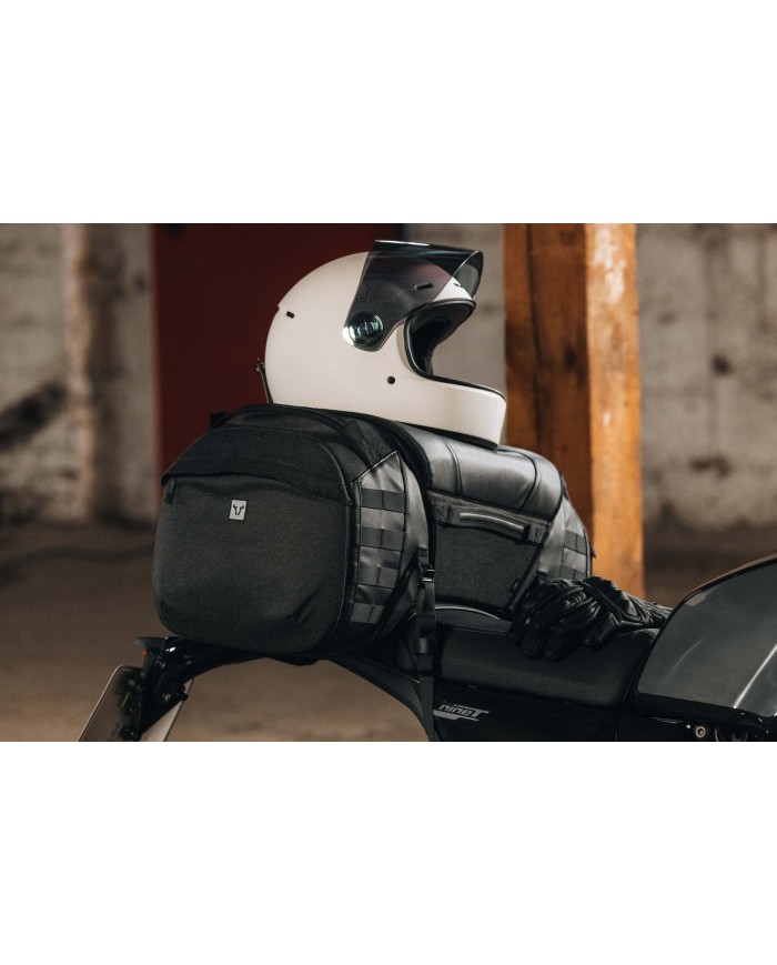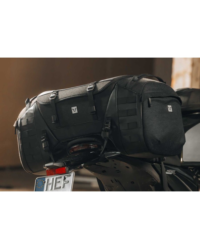 \nLa sacoche arrière, stable en forme, s'adapte parfaitement à la moto, quel que soit le chargement. Les attaches MOLLE permettent de fixer des pochettes supplémentaires, tandis que les poches intérieures étanches et lumineuses protègent le contenu et peuvent être fixées en toute sécurité grâce aux fermetures velcro latérales.