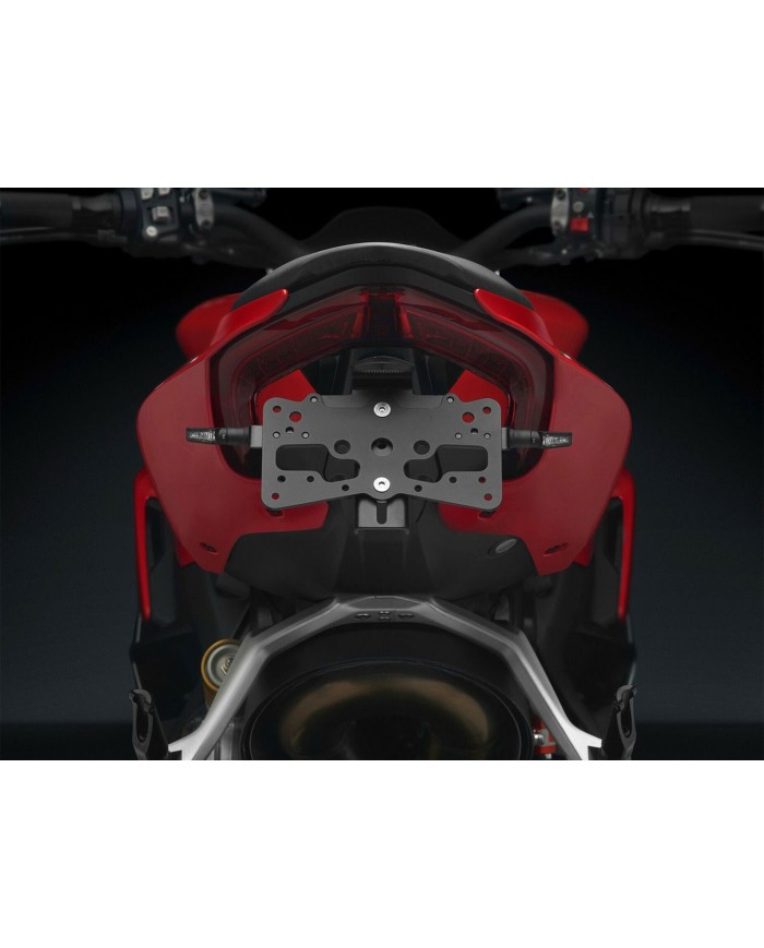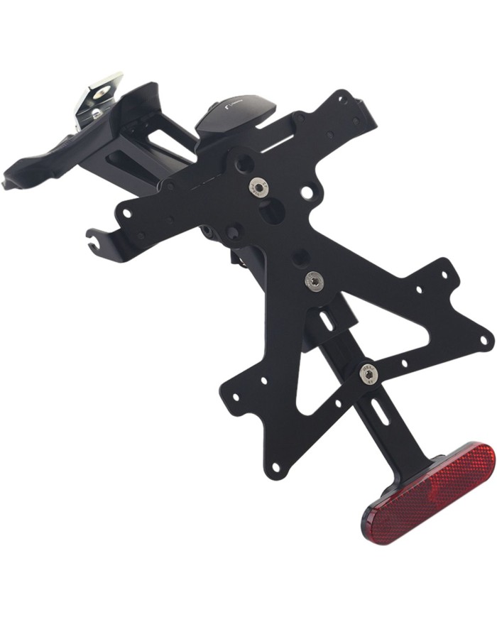 Le support de plaque d'immatriculation Fox en aluminium est spécialement concu pour chaque modèle de moto. Cela lui permet non seulement de s'adapter parfaitement aux lignes de la moto, mais aussi de se distinguer par une installation simple et rapide. Chaque kit contient toutes les pièces de montage nécessaires, sans qu'il soit nécessaire de modifier les pièces OEM. Fonctionnalité maximale dans un espace réduit et respect des normes d'homologation. Les kits Fox comprennent un éclairage de plaque d'immatriculation à LED SMD, un réflecteur et des adaptateurs pour clignotants Rizoma, sont réglables et équipés d'un dispositif de verrouillage pour fixer l'inclinaison correcte.