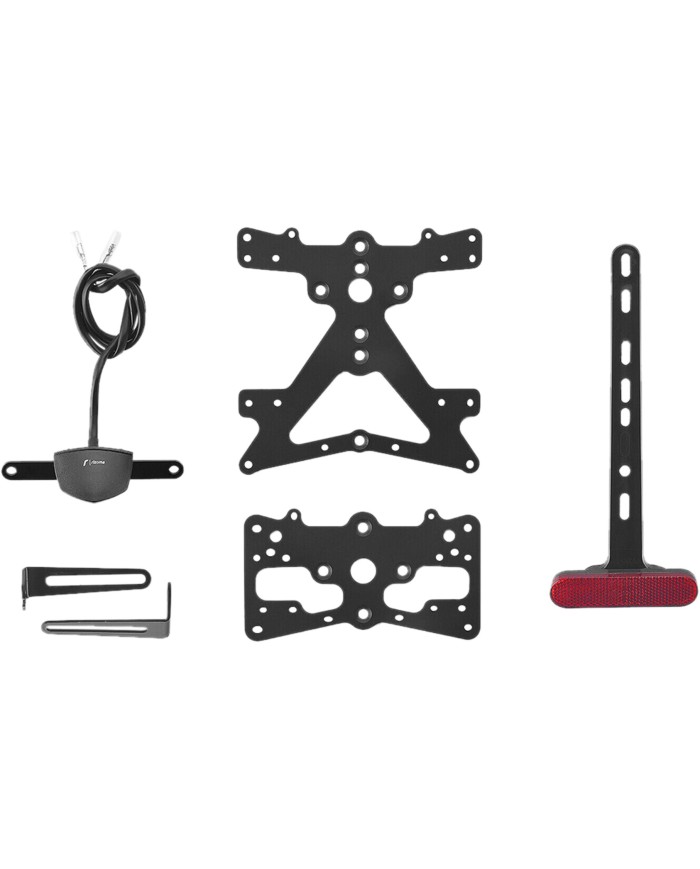 Le support de plaque d'immatriculation Fox en aluminium est spécialement concu pour chaque modèle de moto. Cela lui permet non seulement de s'adapter parfaitement aux lignes de la moto, mais aussi de se distinguer par une installation simple et rapide. Chaque kit contient toutes les pièces de montage nécessaires, sans qu'il soit nécessaire de modifier les pièces OEM. Fonctionnalité maximale dans un espace réduit et respect des normes d'homologation. Les kits Fox comprennent un éclairage de plaque d'immatriculation à LED SMD, un réflecteur et des adaptateurs pour clignotants Rizoma, sont réglables et équipés d'un dispositif de verrouillage pour fixer l'inclinaison correcte.