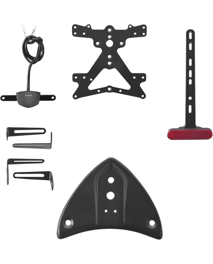 Le support de plaque d'immatriculation Fox en aluminium est spécialement concu pour chaque modèle de moto. Cela lui permet non seulement de s'adapter parfaitement aux lignes de la moto, mais aussi de se distinguer par une installation simple et rapide. Chaque kit contient toutes les pièces de montage nécessaires, sans qu'il soit nécessaire de modifier les pièces OEM. Fonctionnalité maximale dans un espace réduit et respect des normes d'homologation. Les kits Fox comprennent un éclairage de plaque d'immatriculation à LED SMD, un réflecteur et des adaptateurs pour clignotants Rizoma, sont réglables et équipés d'un dispositif de verrouillage pour fixer l'inclinaison correcte.