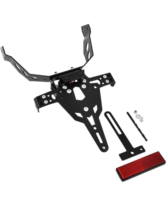 Revêtement époxy noirLe support de plaque d'immatriculation est adapté à tous les types de plaques d'immatriculation (largeur 175 mm)Aucun élément de carénage n'a besoin d'être modifiéL'inclinaison est entièrement réglable3 positions de réglages sont possibles pour les supports de clignotantsAdaptation parfaite, look sportifAucune inscription requise sur le certificat TÜV, aucune homologation ABE nécessaireLes têtes de vis sont également affleurantes au support pour garantir que la plaque d'immatriculation soit placée à plat