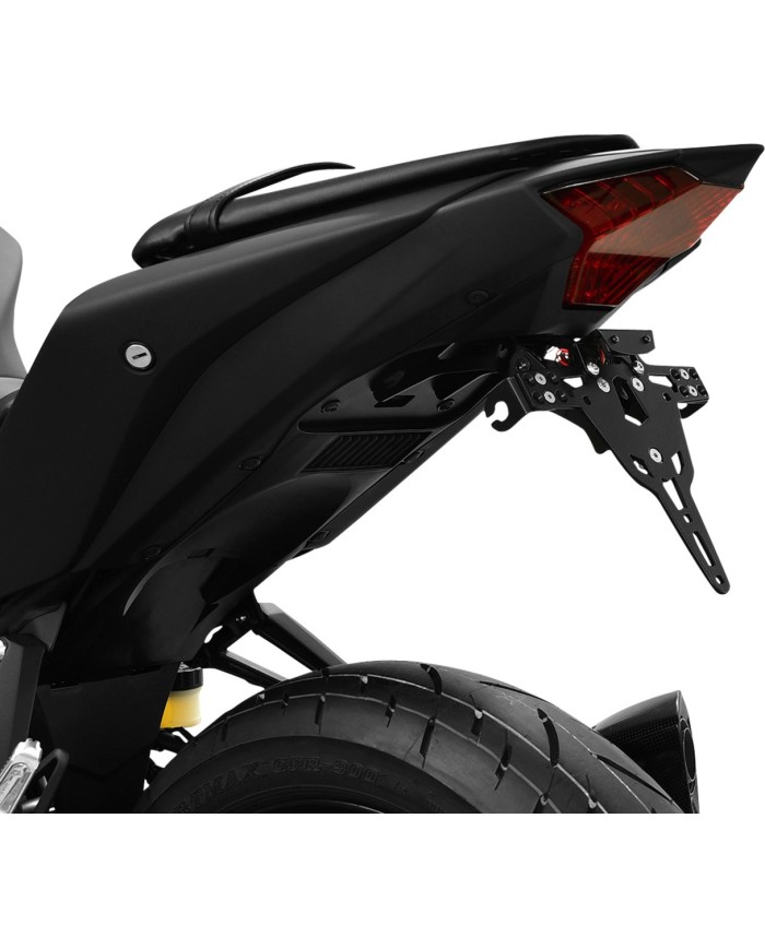 Revêtement époxy noirLe support de plaque d'immatriculation est adapté à tous les types de plaques d'immatriculation (largeur 175 mm)Aucun élément de carénage n'a besoin d'être modifiéL'inclinaison est entièrement réglable3 positions de réglages sont possibles pour les supports de clignotantsAdaptation parfaite, look sportifAucune inscription requise sur le certificat TÜV, aucune homologation ABE nécessaireLes têtes de vis sont également affleurantes au support pour garantir que la plaque d'immatriculation soit placée à plat