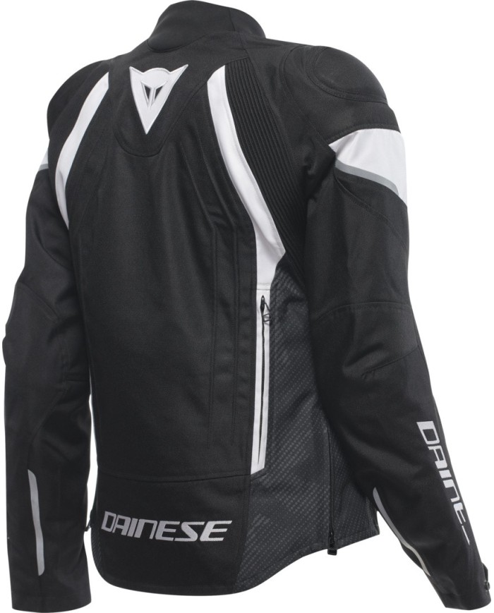 Veste moto sportive pour femmes en tissu D-Synth 350 résistant, avec doublure thermique amovible et fermetures éclair de ventilation. Protection assurée par des protections composites aux épaules et aux coudes, avec poche pour protecteur dorsal. Col ergonomique Veloce Racing, poignets réglables et fermeture éclair de connexion compatible avec tous les pantalons Dainese. Certifiée EN 17092 Classe A.