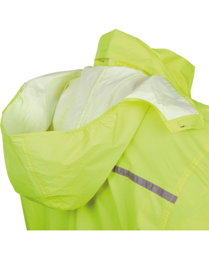 HYDROSCUD® : extérieur en polyamide, respirant, coupe-vent et déperlant avec une colonne d'eau élevée coutures soudées barrière d'eau sur la fermeture éclair centrale (col inclus) EN 14360:2004 -RAIN TOWER TESTED inserts réfléchissants capuche ergonomique qui peut être rangée dans le col cordon de serrage en bas Emballé dans un sac peu encombrant