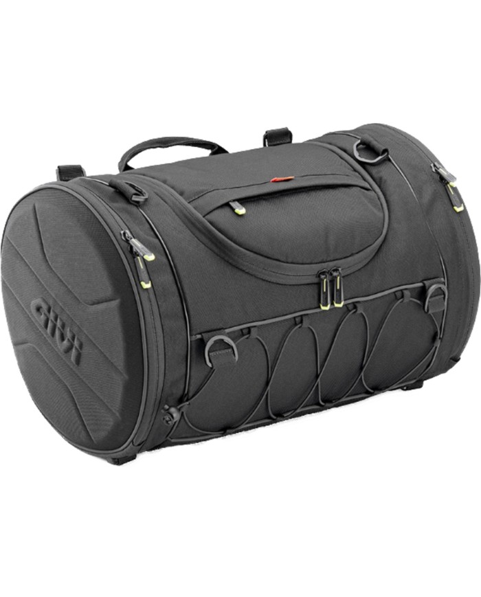 Chiusura a doppia D con cinghie sulla parte anteriore e sui lati della borsa e una cinghia centrale di sicurezza alla base, per fissare la borsa alla sella o alla vita.