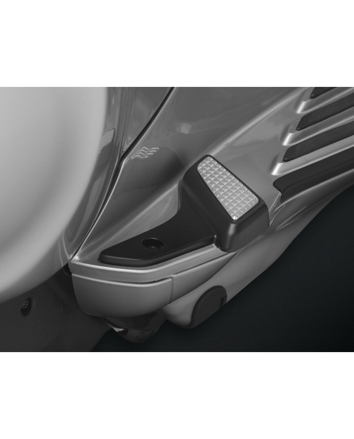 Il corpo strutturale in tecnopolimero massiccio garantisce una resistenza estrema e consente al passeggero di sedersi in tutta sicurezza e comodità sulla Vespa. L'inserto in alluminio anodizzato argento è strutturato per garantire un'aderenza ottimale, offrendo al contempo un design elegante e moderno. Grazie alla certificazione TÜV, potete essere certi che questi poggiapiedi soddisfano i più elevati standard di sicurezza.