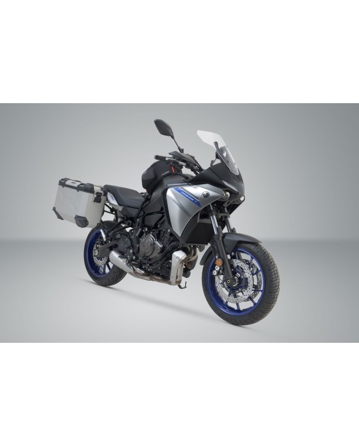 \r\nLe robuste valigie in alluminio TRAX ADV sono perfette per qualsiasi tipo di strada: le stampature di design sostengono la stabilità del materiale delle pareti in alluminio saldato dello spessore di 1,5 millimetri. Un coperchio completamente rimovibile con maniglie in alluminio anodizzato e chiusure rapide facilita il carico e lo scarico delle valigie da moto, mentre il bordo laterale smussato offre un'elevata altezza da terra in curva. Con questa soluzione completa, avete tutti i componenti necessari per partire direttamente per un lungo viaggio con TRAX: due valigie laterali TRAX ADV impermeabili, due supporti laterali rimovibiliSW-MOTECH, un kit di adattamento, un set di serrature, limitatori di apertura e una protezione antifurto ad un prezzo complessivo interessante. I supporti specifici per il modello e le dimensioni delle valigie sono perfettamente adattati alla geometria posteriore e al sistema di scarico della moto.